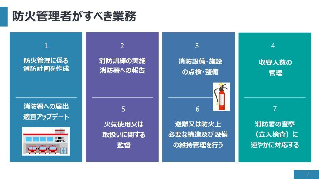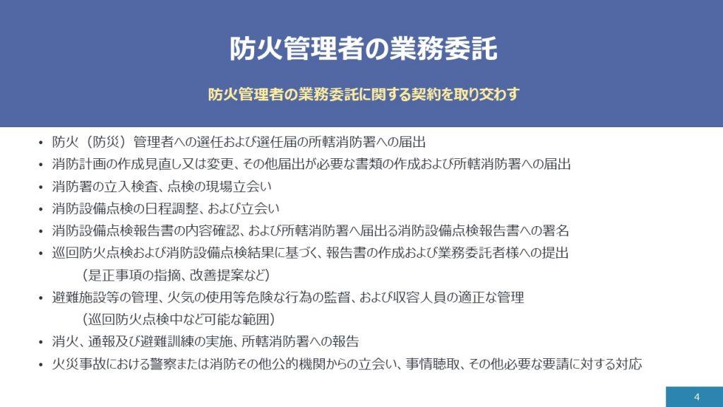 しかしながら、有資格者(防火管理者の資格を取得)を選任し、日常の業務に加えて防火管理者の煩雑な業務を実施することは困難でもあります。そこで、弊社の有資格者と経験を活かし、防火管理者の外部委託をさせていただくサービスを開始いたしました。