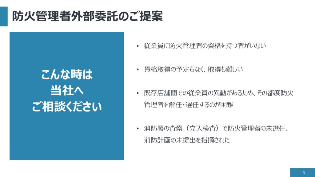 新サービストとして防火管理者の外部委託サービスを開始いたしました。