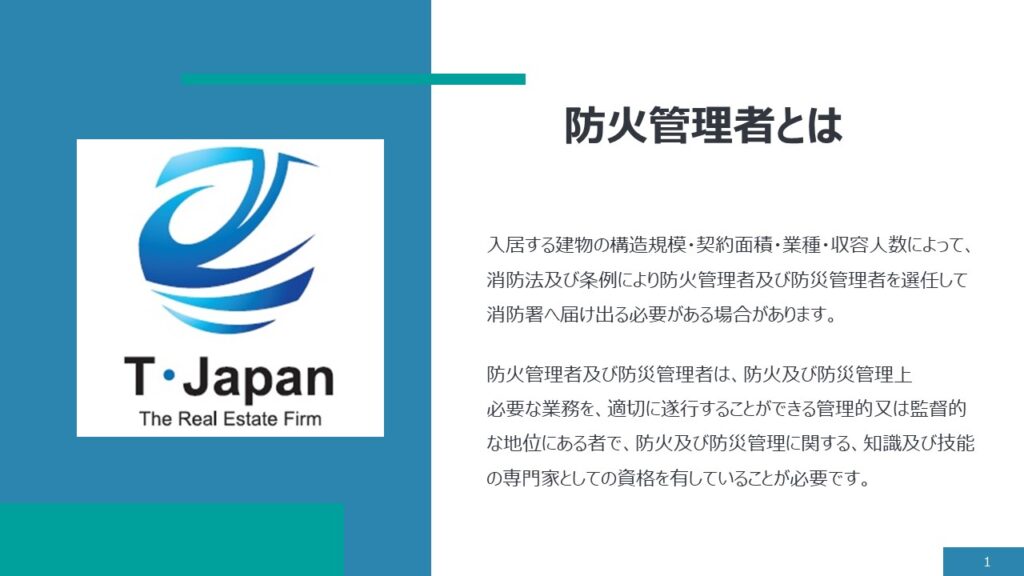 入居されている建物の構造・規模・契約面積・業種・収容人数によって、消防法及び条例により防火管理者及び防災管理者を選任して消防署へ届け出る必要がある場合があります。怠ると消防署の査察(立入検査)で防火管理者の未選任、消防計画の未提出を指摘されることがあり、安全面・法的側面から必ず対応しなければならない事項となります。